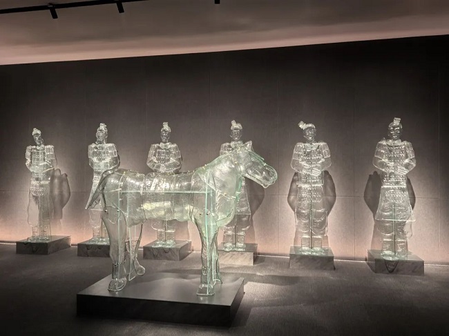 Terracotta Warriors are showcased at the Glassware Exhibition Hall of the Wuxi Green Wave Art Museum. [Photo/Wuxi Daily]